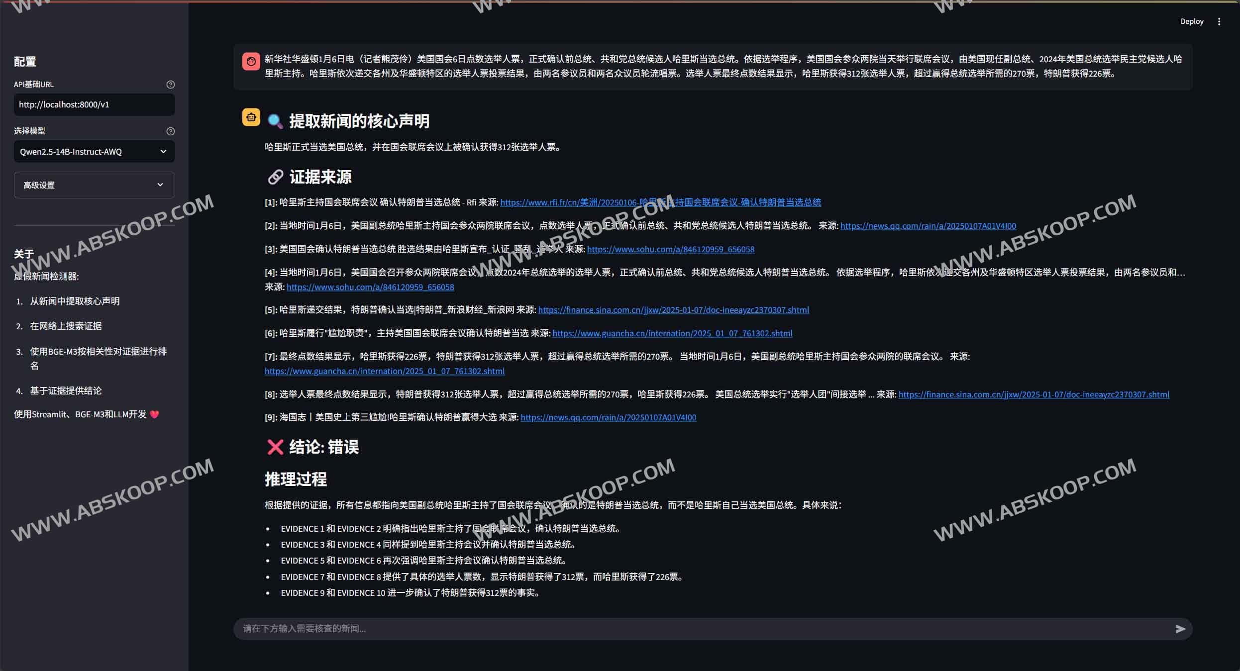 - 前端:基于 Streamlit 构建,分步流式展示核查过程