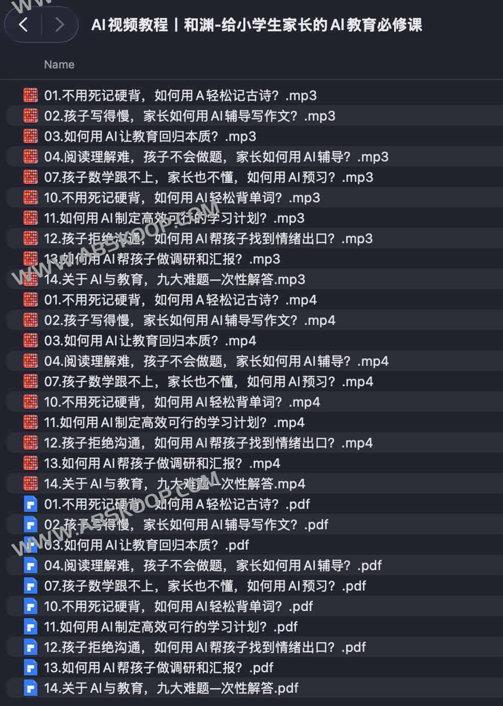 AI视频教程丨和渊-给小学生家长的Al教育必修课,这是一门专为小学生家长打造的AI教育实操课,由教育专家和渊讲授,聚焦“家长如何用AI真正帮孩子学习”。课程通过音频、视频与讲义三种形式呈现,覆盖语文、英语、数学及情绪管理等学习场景,让家长从焦虑陪伴者变成高效引导者。